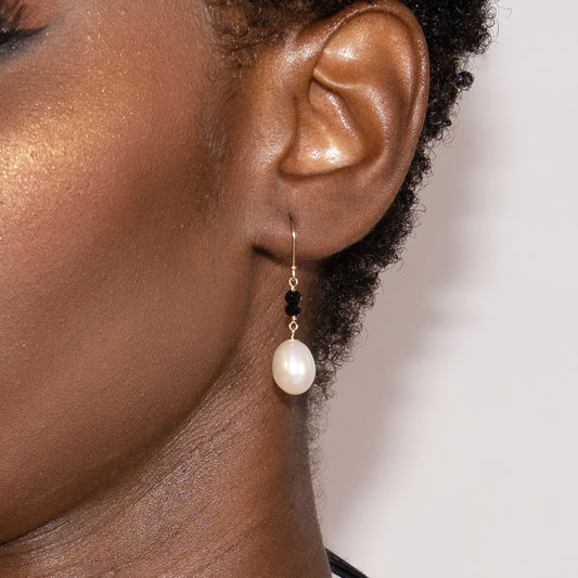 14k White Freshwater Pearl Black Spinel Hook Earring