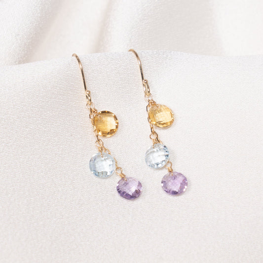 14k Citrine, Blue Topaz, and Amethyst Triple Coin Hook Earring